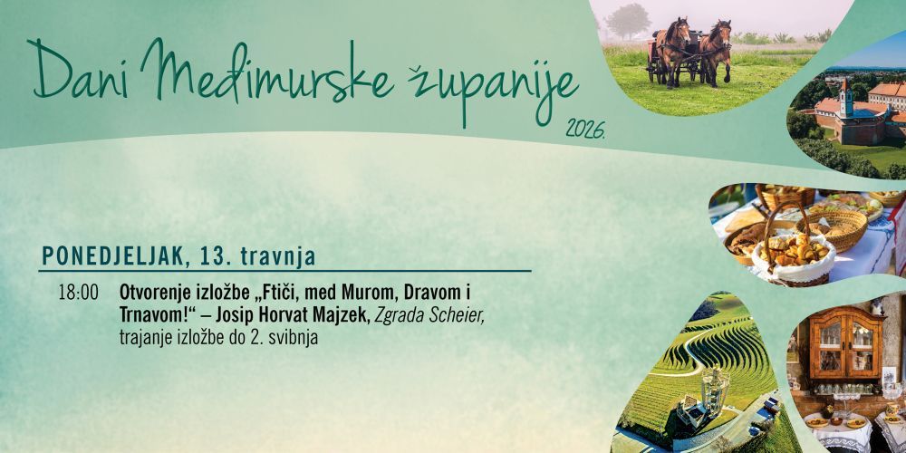Izložbom fotografija nazvanom Ftiči med Murom i Dravom Danima Međimurske županije pridružuje se ovim zanimljivim postavom fotograf Josip Horvat Majzek. Tematska Izložba se otvara u ponedjeljak, 13. travnja u Zgradi Scheier u Čakovcu od 18 sati i posjetitelji će je moći razgledati sve do 2. svibnja.