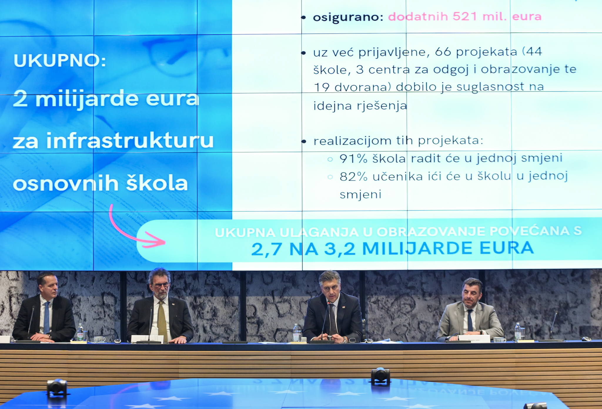 Svečanoj dodjeli ugovora prisustvovao je predsjednik Vlade RH Andrej Plenković koji je istaknuo kako se u obrazovnu infrastrukturu trenutno ulaže 2,7 milijardi eura, od dječjih vrtića, osnovnih i srednjih škola pa do fakulteta i sportskih dvorana.