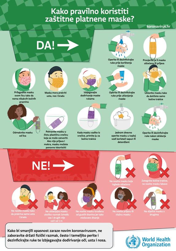 korištenje ispravnih maski – ne dotrajalih ili prljavih, koje su izrađene od neodgovarajućeg materijala, maske moraju biti funkcionalne ispravo nošenje maski – ne ispod brade, maske moraju prekrivati nos i usta, maske moraju biti odgovarajuće veličine