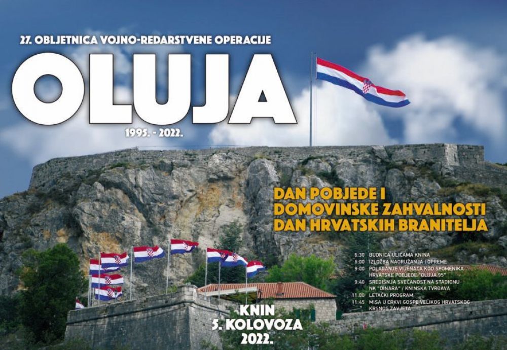 Ne bude li grmljavinskog nevremena, u 9:44 hrvatsku će zastavu na vrhu kninske tvrđave podići hrvatski branitelji i članovi obitelji stradalih. Središnji dio proslave održat će se na glavnom kninskom trgu.