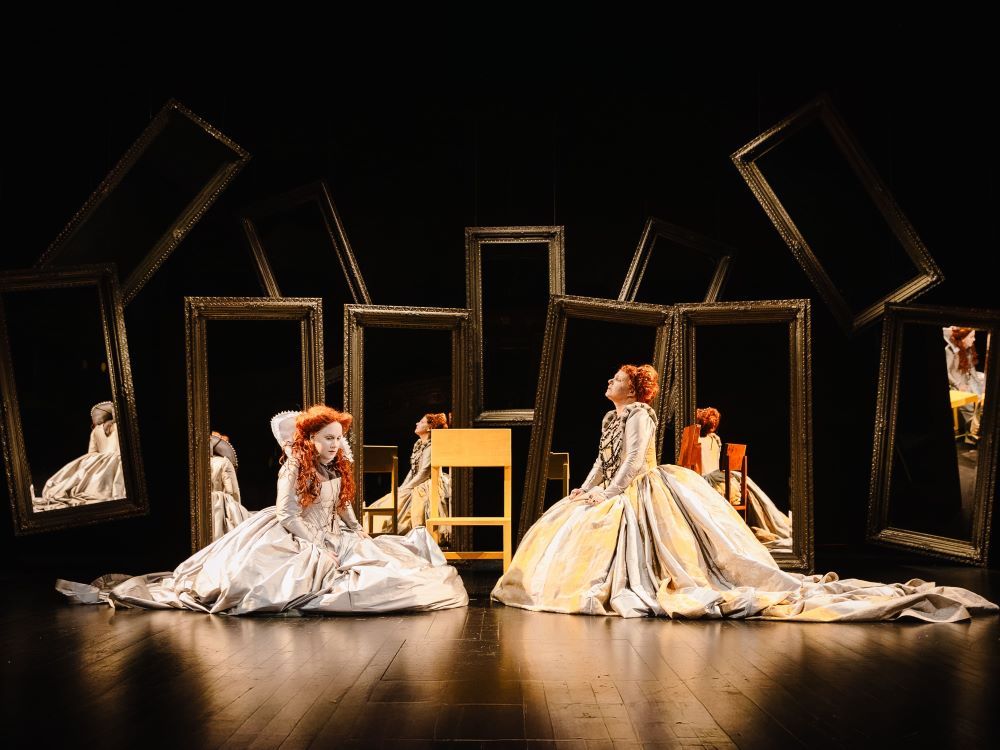 U režiji i dramaturgiji Marina Blaževića fokus je usmjeren na karakterni kontrapunkt, dramski sukob i čuvenu scenu konfrontacije dviju kraljica. Njihove nasuprotne osobnosti i životne situacije, kao i intenzitet njihova konflikta potenciraju raskošni kostimi ekstremnih dimenzija u kreaciji Sandre Dekanić. U našoj predstavi dvije kraljice (engleska i škotska), odnosno dvije žene sučeljene u borbi za vlast, svoja uvjerenja, ali i za ljubav istog muškarca, smještene su u prostor koji bi se mogao opisati kao kazališni kaleidoskop: u brojnim ogledalima postavljenim uokolo pozornice udvajaju se i nadalje multipliciraju, preklapaju i prelamaju, spajaju i razdvajaju zrcalni odrazi ne samo fizičkih pojava nego i doživljajnih odnosno izražajnih reakcija, misli i stavova dviju ujedno fatalno povezanih i razdvojenih, paradoksalno srodnih i raznoronih, upravo kobnih - dvojnica, sestara - koje to nisu mogle niti smjele biti. Tu nepodnošljivu udaljenost u bliskosti, ovisnost u zasebnosti, ljubav u mržnji, mogao je okončati samo poraz jedne od njih dvije. No - koje, pitamo se naposljetku?